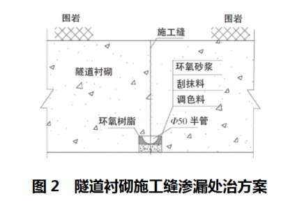 该高速公路于2012年7月正式通车,根据2014年4月年的检查结果,隧道出现了不同程度的渗漏水病害,其中施工缝渗漏最为严重,发生部位多为边墙。随后对该隧道渗漏较为严重4条相邻的衬砌施工缝进行了处治,采用凿槽埋设排水半管的方式对衬砌施工缝处的渗水进行引排(见图2)。