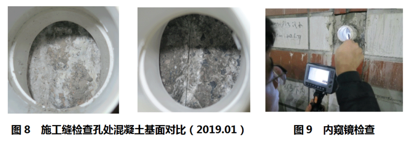 该隧道处治后,于2018年10月至今进行了数次检查回访,以检验处治的效果。将施工缝的检查孔打开进行观察对比(见图8),并将工业内窥镜的镜头从衬砌边墙部位的检查孔内伸入排水半管内,重点查看从边墙到墙脚范围内排水半管内部的情况,以确定排水管内结晶和堵塞的程度,在关键部位停留并利用内窥镜进行拍照和摄像(见图9)。