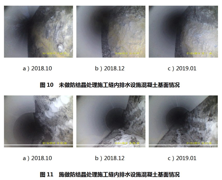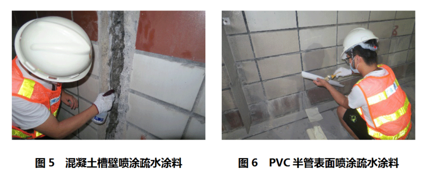 (1)排水设施基面防结晶措施。采用本公司的YHYD-SS-NM涂料在图2所示的排水构造内部的混凝土和PVC排水半管基面上涂刷一层该涂料,以提高与渗水接触基面的防结晶性能。共处治了2条施工缝,与其他2条施工缝对比。