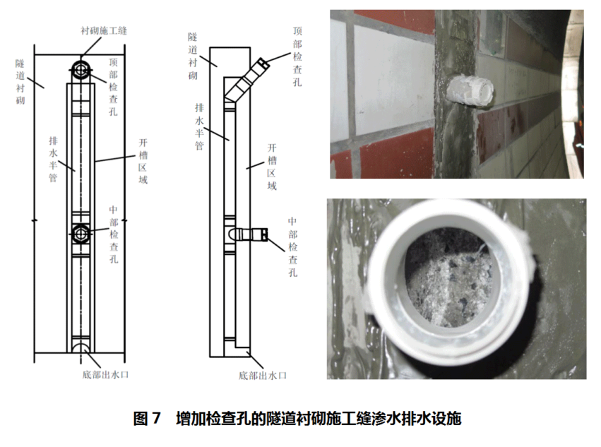 (2)排水设施可维护性提高措施。采用本公司的专利技术,设计了带有检查孔的衬砌施工缝渗漏水引排设施(见图7),在排水半管的顶部、中部预留了检查孔,检查孔的顶盖伸出衬砌混凝土的表面,可以拧开检查孔的顶盖对排水半管的内部进行检查和清洗。
